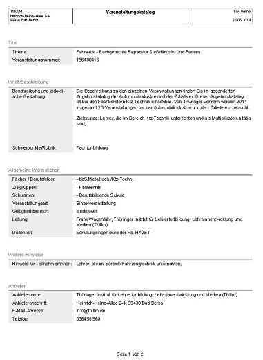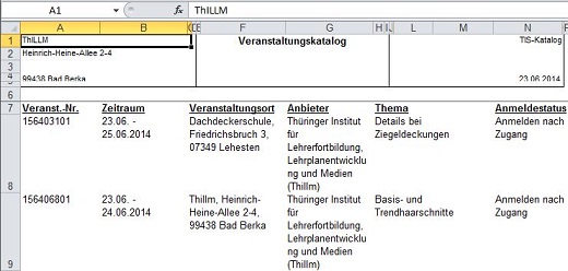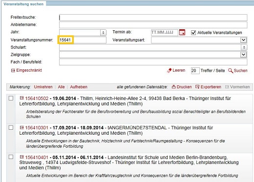 - Ergänzt man die Suche nach Veranstaltungsnummern durch W, M, O, N oder S, sucht also im Ergebnis beispielsweise nach 32W, erhält man alle Veranstaltungen des Anbieters Staatliches Schulamt Westthüringen für das Jahr 2014 (analog M für Mittelthüringen, O für Ostthüringen, N für Nordthüringen, S für Südthüringen).