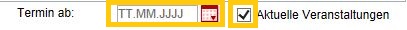 Man kann auch über den Kalender oder direkt in das Feld "Termin ab:" einen konkreten Beginntermin eingeben. Im Ergebnis werden alle Veranstaltungen ab diesem Termin eventuell gekoppelt mit weiteren Suchkriterien gefunden.