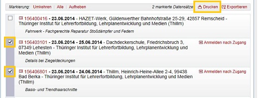Sie können einzelne Veranstaltungen aus der Trefferliste markieren, die dann bei den Funktionen DRUCKEN und EXPORTIEREN berücksichtigt werden. Wählen Sie hier keine konkrete Veranstaltung aus, wird die gesamte Trefferliste umgesetzt.