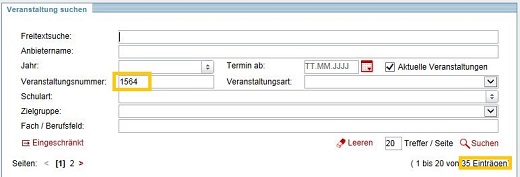 Ebenso können Sie im Feld "Veranstaltungsnummer" Teile der Veranstaltungsnummer eingeben. Die ersten zwei Ziffern einer Veranstaltungsnummer stehen dabei für das aktuelle Jahr, zum Beispiel