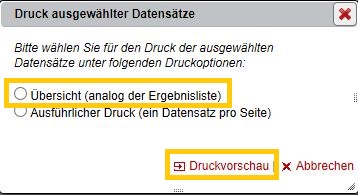 Der Übersichtsdruck liefert bei Betätigung des Links DRUCKVORSCHAU die Daten der Trefferliste in einem pdf-Dokument.