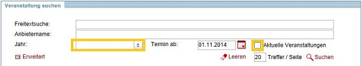 Beachten Sie bitte dabei stets die voreingestellte Option "Aktuelle Veranstaltungen". Ausgegeben werden standardmäßig immer alle Angebote ab Suchdatum in die Zukunft. Wenn Sie nach vergangenen Veranstaltungen suchen wollen, nehmen Sie den Haken bei "Aktuelle Veranstaltungen" bitte heraus oder wählen Sie ein entsprechendes Jahr.