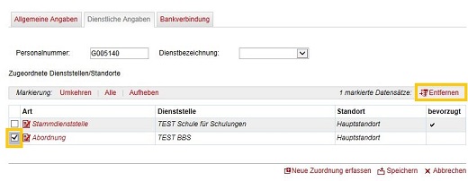 Wenn Sie über den Link DIENSTLICHE ANGABEN in den nächsten Reiter wechseln, können Sie hier Ihre Zuordnungen zur Stammschule oder anderen Schulen/Dienststellen (zum Beispiel Abordnung) einsehen. Dabei muss eine Zuordnung als bevorzugt gekennzeichnet sein.