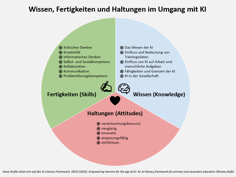 Um die Kompetenzen zu beschreiben, die für den Umgang mit KI erforderlich sind und eine Integration in bestehende Kompetenzmodelle und Lehrpläne zu erreichen dient der AI Literacy (AILit) Framework als zentrale Orientierung. Dieser Rahmen wurde von der OECD entwickelt und beschreibt, welche Kenntnisse, Fähigkeiten und Haltungen notwendig sind, um in einer von KI geprägten Welt handlungsfähig zu bleiben. Nicht nur als Nutzende, sondern auch als kritisch denkende Gestaltende.