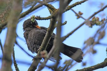 Das Foto hehört zur Serie "Amseln". Es zeigt eine Amsel (Turdus merula), auch Schwarzdrossel genannt, eine Vogelart der Familie der Drosseln. Die Männchen sind schwarz gefärbt und haben einen gelben Schnabel, das Gefieder der Weibchen ist größtenteils dunkelbraun. Es gelten die Nutzungsbedingungen der Mediothek und Pixiothek.