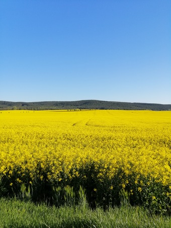 Das Foto gehört zur Serie "Nutzpflanzen". Es zeigt ein blühendes Rapsfeld. Das Bild ist unter CC0 lizenziert und kann somit frei verwendet werden.