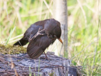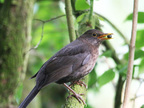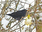 Das Foto hehört zur Serie "Amseln". Es zeigt ein Amselmännchen beim Füttern eines Jungvogels. Die Männchen sind schwarz gefärbt und haben einen gelben Schnabel, das Gefieder der Weibchen ist größtenteils dunkelbraun. Es gelten die Nutzungsbedingungen der Mediothek und Pixiothek.