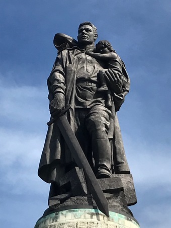 Das Sowjetische Ehrenmal ist eine Gedenkstätte und ein Soldatenfriedhof im Treptower Park in Berlin. Die im Mai 1949 fertiggestellte Anlage wurde auf Weisung der Sowjetischen Militäradministration in Deutschland errichtet, um die im Zweiten Weltkrieg gefallenen Soldaten der Roten Armee zu ehren. Es wurden ca. 7000 der in der Schlacht um Berlin gefallenen Soldaten hier bestattet. Ein breit angelegter, leicht ansteigender und von „trauernden“ Birken gesäumter Weg führt zum Hauptfeld der Gedenkstätte. Der Weg ist markiert durch zwei große, stilisierte Fahnen. An ihrer Stirnseite befindet sich jeweils die Skulptur eines knienden Soldaten in voller Montur und mit einer Maschinenpistole bewaffnet. Sechzehn weiße Sarkophage stehen entlang der äußeren Begrenzung. Sie sind auf den beiden Längsseiten mit Reliefs aus der Geschichte des Großen Vaterländischen Krieges der Sowjetvölker versehen und tragen auf der dem zentralen Feld zugewandten Schmalseite Zitate von Josef Stalin. Der zentrale Ort der Anlage wird durch eine auf einem Sockel stehende Skulptur „Der Befreier“ von Jewgeni Wutschetitsch gebildet. Die Figur stellt einen Soldaten dar, der in der rechten Hand ein Schwert und auf dem linken Arm schützend ein Kind trägt; ein Hakenkreuz zerbricht unter seinen Stiefeln. Die Skulptur ist 12 Meter hoch und 70 Tonnen schwer.