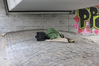 Das Foto zeigt einen Obdachlosen shlafend unter einer Brücke in Hamburg. Das Bild ist unter CC0 lizenziert und kann somit frei verwendet werden.