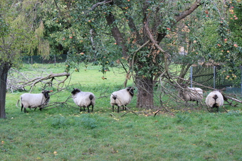 Das Foto gehört zur Serie "Bauernhof". Es zeigt Schafböcke unter einem Apfelbaum. Das Hausschaf (Ovis gmelini aries) ist die domestizierte Form des Mufflons. Das Bild ist unter CC0 lizenziert und kann somit frei verwendet werden.