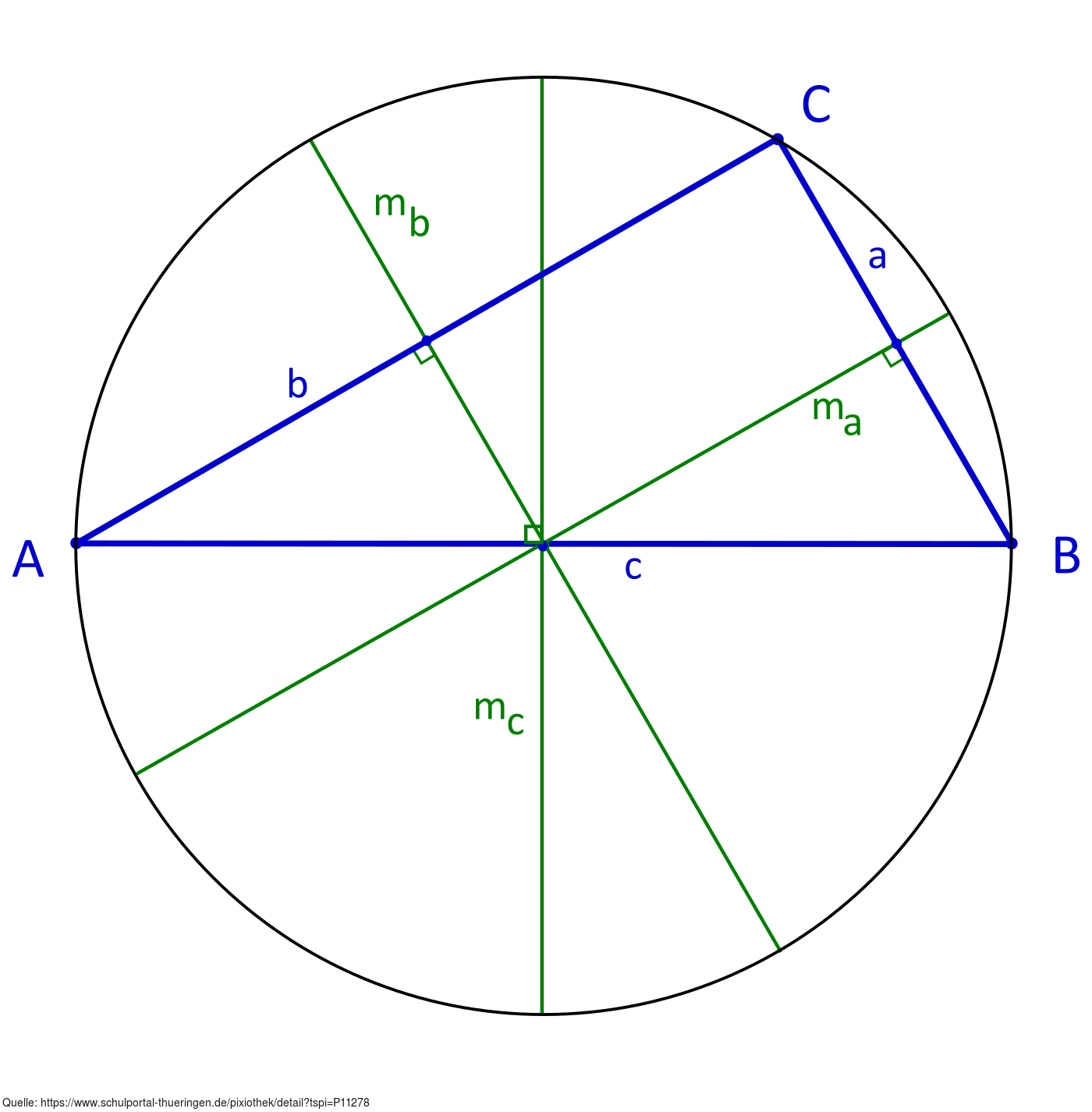 Das Bild gehört zur Serie "Mathematik Geometrie". Es zeigt die drei Mittelsenkrechten in einem rechtwinkligen Dreieck. Die Mittelsenkrechten schneiden sich in einem Punkt. Das ist der Mittelpunkt vom Umkreis des Dreiecks. Das Bild ist unter CC0 lizenziert und kann somit frei verwendet werden.