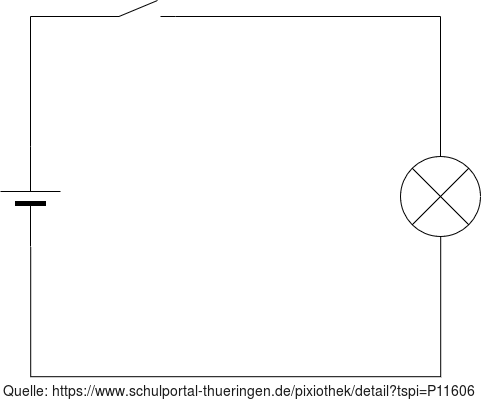 Das Bild gehört zur Serie "Elektrische Schaltungen". Es zeigt den Schaltplan eines einfachen Stromkreises mit Spannungsquelle (Batterie), Schalter und einem Verbraucher (Glühlampe). Das Bild ist unter CC0 lizenziert und kann somit frei verwendet werden.