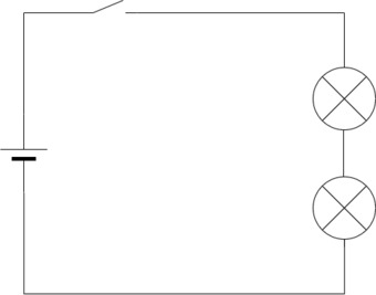 Das Bild gehört zur Serie "Elektrische Schaltungen". Es zeigt den Schaltplan einer Reihenschaltung mit Spannungsquelle (Batterie), Schalter und zwei Verbrauchern (Glühlampen). Das Bild ist unter CC0 lizenziert und kann somit frei verwendet werden.