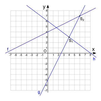 Das Bild gehört zur Serie "Mathematik, lineare Funktionen". Es zeigt im Koordinatensystem drei lineare Funktionen. Die Funktionsgleichungen sind zu ermitteln. Weiterhin können Koordinaten von Schnittpunkten und Nullstellen abgelesen werden. Das Bild steht in den Ausführungen normal, leichte Hilfen, und mehrfache Hilfen zur Verfügung. Das Bild ist unter CC0 lizenziert und kann somit frei verwendet werden.