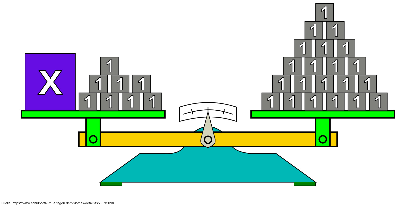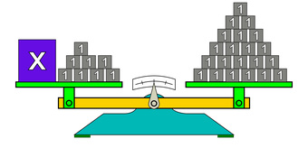 Das Bild gehört zur Serie "Mathematik, Gleichungen". Es veranschaulicht eine linearen Gleichung durch Körper auf einer Waage. Das Bild ist unter CC0 lizenziert und kann somit frei verwendet werden.