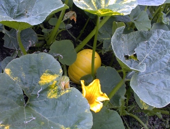Das Bild gehört zur Serie "Gemüsepflanzen". Es zeigt Blätter und Blüte einer Kürbispflanze. Es gelten die Nutzungsbedingungen der Mediothek und Pixiothek.