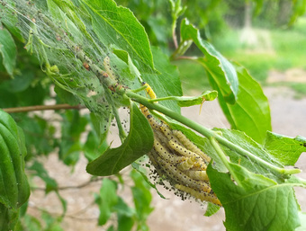 Das Bild gehört zur Serie "Schmetterlinge". Es zeigt Raupen der Gespinstmotte. Diese bilden im Mai und Juni auffällige Gespinste zwischen kahlgefressenen Zweigen. In den durch schwarze Kotkrümel verschmutzten Gespinsten leben oft große Mengen der Larven. Es gelten die Nutzungsbedingungen der Mediothek und Pixiothek.