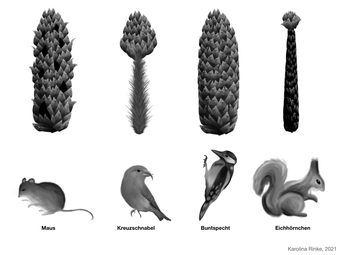 Die Grafik gehört zur Serie "Fraßspuren". Dargestellt sind Zapfenfraßspuren von Maus, Eichhörnchen, Buntspecht und Fichtenkreuzschnabel in falscher Zuordnung, s/w. Es gelten die Nutzungsbedingungen der Mediothek und Pixiothek.