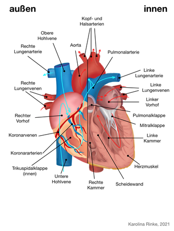Das Bild gehört zur Serie "Organe des Menschen". Das Bild verdeutlicht den Aufbau des menschlichen Herzens. Bild-Variante: Herz mit Blutstrom; farbig; beschriftet. Es gelten die Nutzungsbedingungen der Mediothek und Pixiothek.