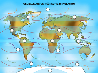 Das Bild gehört zur Serie „Zirkulationssysteme der Erde“. Es verdeutlicht die globale atmosphärische Zirkulation der Erde. Bild-Variante: farbig; unbeschriftet; mit Pfeilen für Winde. Es gelten die Nutzungsbedingungen der Mediothek und Pixiothek.