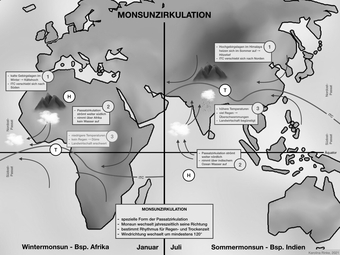 Das Bild gehört zur Serie „Zirkulationssysteme der Erde“. Es verdeutlicht die Monsunzirkulation der Erde. Bild-Variante: s/w; beschriftet. Es gelten die Nutzungsbedingungen der Mediothek und Pixiothek.
