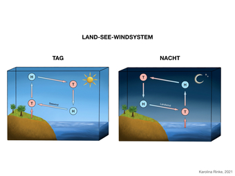 Das Bild gehört zur Serie „Zirkulationssysteme der Erde“. Es verdeutlicht das Land-See-Windsystem der Erde. Bild-Variante: farbig; beschriftet. Es gelten die Nutzungsbedingungen der Mediothek und Pixiothek.