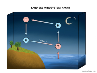 Das Bild gehört zur Serie „Zirkulationssysteme der Erde“. Es verdeutlicht das Land-See-Windsystem der Erde. Bild-Variante: farbig; beschriftet; Nacht. Es gelten die Nutzungsbedingungen der Mediothek und Pixiothek.