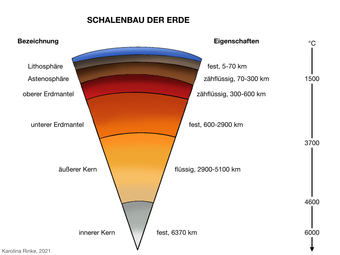 Das Bild verdeutlicht den Schalenaufbau der Erde. Bild-Variante: farbig; beschriftet. Es gelten die Nutzungsbedingungen der Mediothek und Pixiothek.