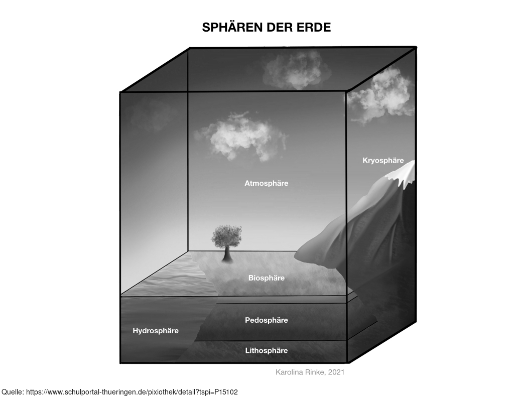 Das Bild verdeutlicht die Sphären der Erde (Hüllenaufbau). Bild-Variante: s/w; beschriftet. Es gelten die Nutzungsbedingungen der Mediothek und Pixiothek.