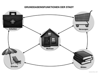 Das Bild verdeutlicht die Grunddaseinsfunktionen (der Stadt). Bild-Variante: s/w; beschriftet. Es gelten die Nutzungsbedingungen der Mediothek und Pixiothek.
