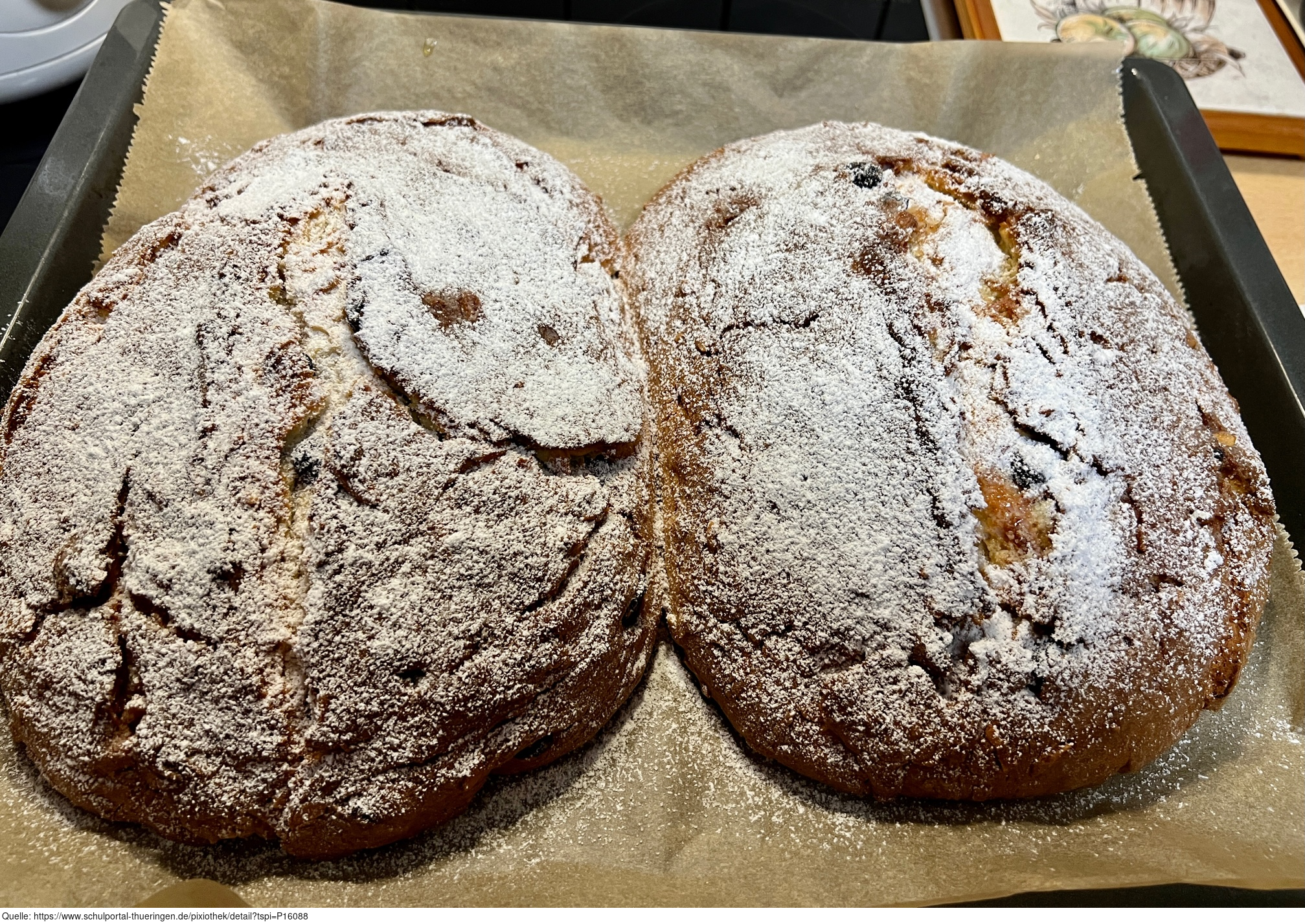 Das Bild zeigt eine Bearbeitungsstufe beim Backen eines Weihnachtsstollens bzw. Christstollens. Es gelten die Nutzungsbedingungen der Mediothek und Pixiothek.
