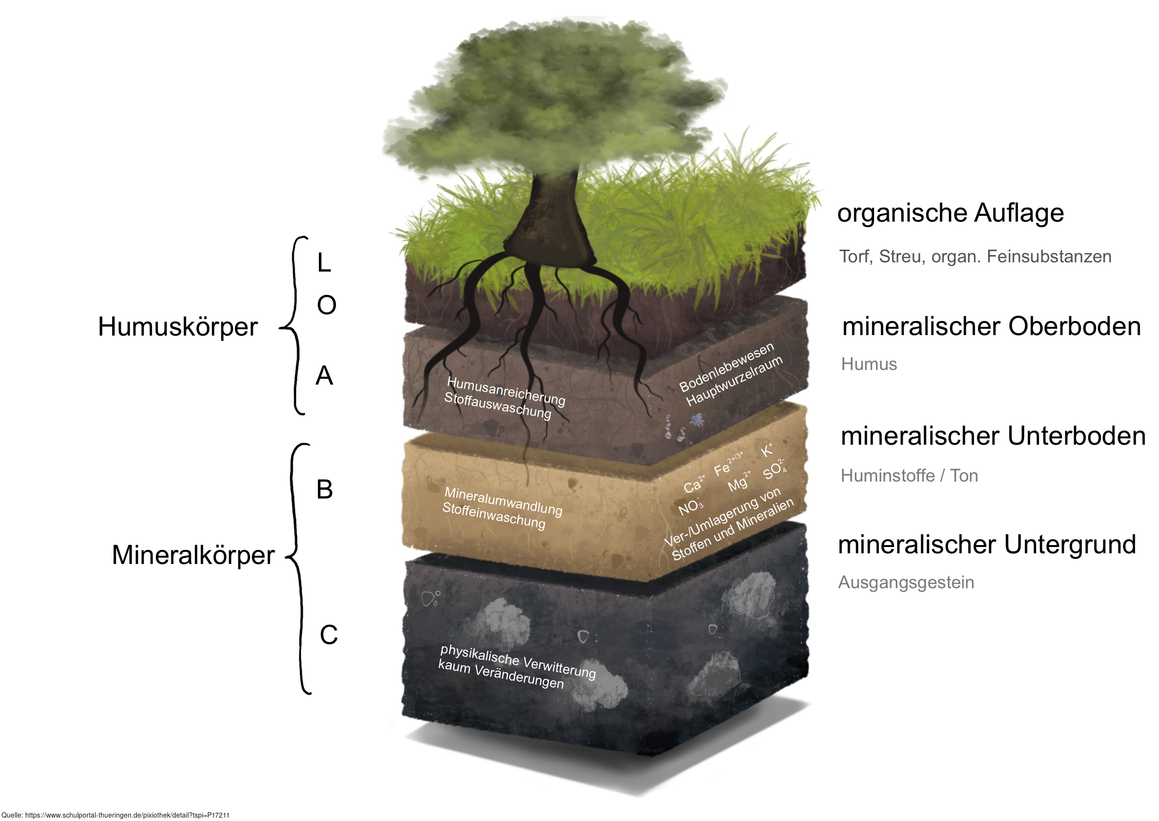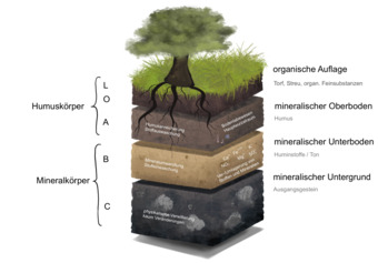 Das Bild verdeutlicht den typischen Aufbau des Bodens und die Zusammensetzung der jeweiligen Bodenhorizonte. Variante: farbig; beschriftet. Es gelten die Nutzungsbedingungen der Mediothek und Pixiothek.