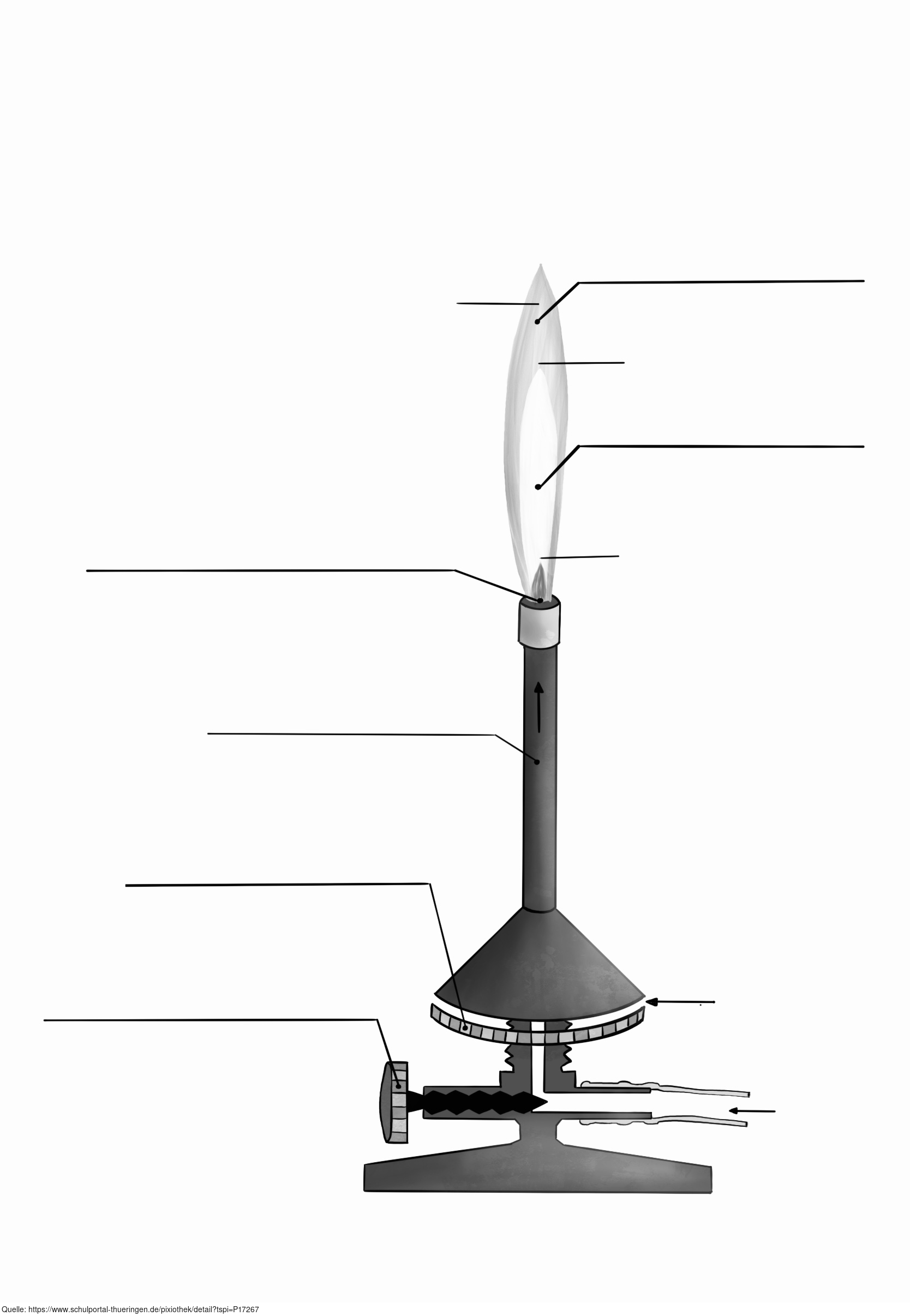 Das Bild verdeutlicht den Aufbau eines Bunsenbrenners. Variante: eine Flamme, s/w; unbeschriftet. Es gelten die Nutzungsbedingungen der Mediothek und Pixiothek.