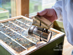 Das Bild gehört zur Serie "Saalfelder Honig", aufgenommen vom Imker Bernd Rümpler, Inhaber von saalfelder-honig.de. Zu sehen ist eine weibliche Honigbiene (Arbeiterin) mit Pollenhöschen.