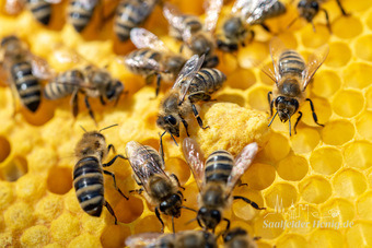 Das Bild gehört zur Serie "Saalfelder Honig", aufgenommen vom Imker Bernd Rümpler, Inhaber von saalfelder-honig.de. Zu sehen sind Arbeiterbienen (Stockbienen) bei der Brutpflege (zentral im Bild eine Weiselzelle oder Nachschaffenszelle für eine Königin).