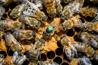 Das Bild gehört zur Serie "Saalfelder Honig", aufgenommen vom Imker Bernd Rümpler, Inhaber von saalfelder-honig.de. Zu sehen ist eine Bienenkönigin (gezeichnet) umringt von Arbeiterinnen (Stockbienen) bei der Eiablage. Dazu schiebt sie ihren Hinterleib in die Zelle.