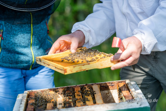 Imker am geöffnete Bienenvolk mit gezogener Wabe