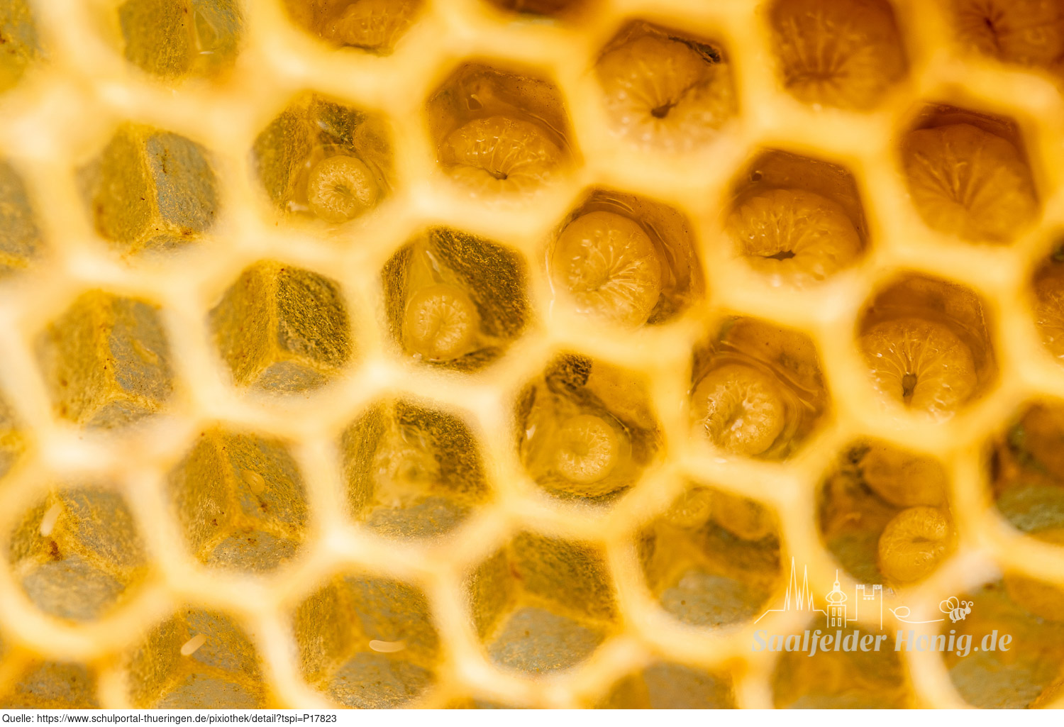 Das Bild gehört zur Serie "Saalfelder Honig", aufgenommen vom Imker Bernd Rümpler, Inhaber von saalfelder-honig.de. Zu sehen ist eine Bienenwabe mit Eiern und Maden. Links unten: frisch gelegte Eier (Stifte). Darüber: kleine geschlüpfte Maden im Futtersaft. Rechts oben: große Maden im Futtersaft.