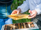 Das Bild gehört zur Serie "Saalfelder Honig", aufgenommen vom Imker Bernd Rümpler, Inhaber von saalfelder-honig.de. Zu sehen ist ein Imker am geöffneten Bienenvolk mit gezogener Wabe. Es gelten die Nutzungsbedingungen der Mediothek und Pixiothek.