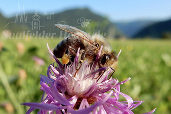Das Bild gehört zur Serie "Saalfelder Honig", aufgenommen vom Imker Bernd Rümpler, Inhaber von saalfelder-honig.de. Zu sehen ist eine Flugbiene auf einer Kornblume. Die Biene klebt Pollen an ihre Hinterbeine, indem sie diesen mit körpereigenen Stoffen vermischt - Pollenhöschen – In ihrem Fell haften sich Pollenkörnchen an, durch welche dann auf der nächsten Blüte deren Befruchtung erfolgt.