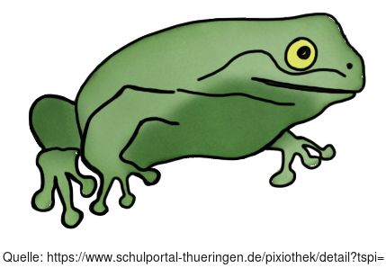 Das Bild zeigt einen gezeichneten Frosch. Das Bild ist unter CC0 lizenziert und kann somit frei verwendet werden. Es ist neben weiteren Bildern auch hier zu finden: https://moodlelab.moodleschule.de/