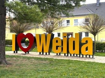 Das Bild zeigt einen Schriftzug mit dem Stadtnamen von Weida.