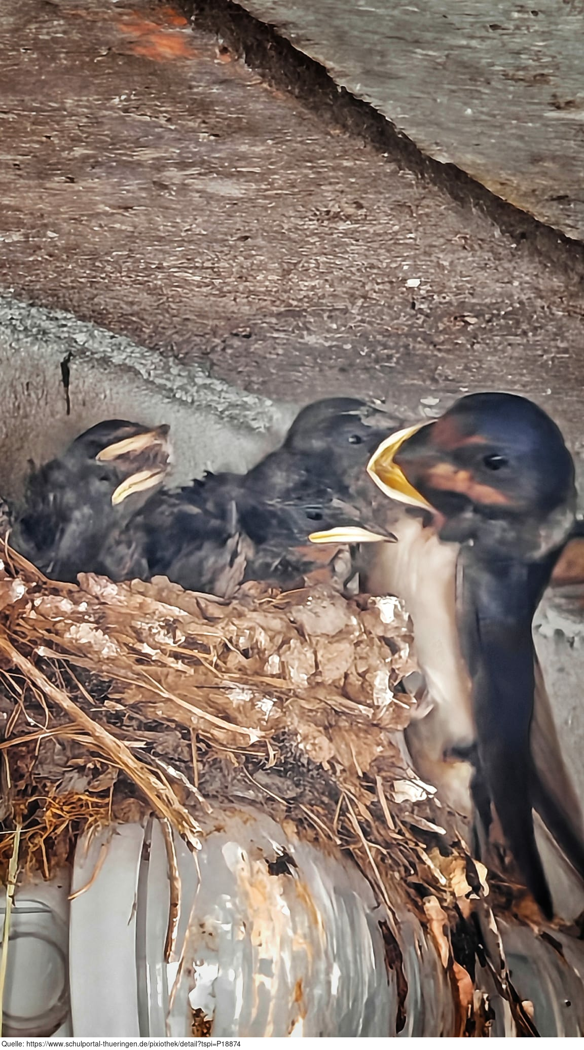 Das Foto gehört zur Serie "Schwalbenfreundliches Haus". Es zeigt junge Rauchschwalben bei der Fütterung im Nest. Das Nest befindet sich in einer Scheune, die für Vögel und Fledermäuse einige offene Durchflugsmöglichkeiten bereithält. Es gelten die Nutzungsbedingungen der Mediothek und Pixiothek.