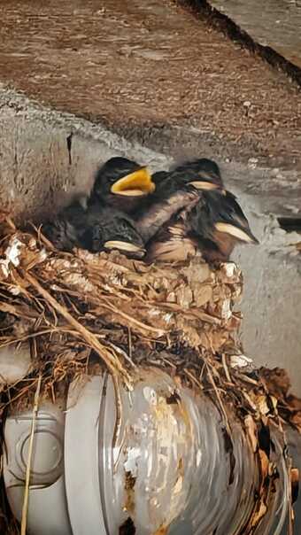 Das Foto gehört zur Serie "Schwalbenfreundliches Haus". Es zeigt junge Rauchschwalben im Nest. Das Nest befindet sich in einer Scheune, die für Vögel und Fledermäuse einige offene Durchflugsmöglichkeiten bereithält. Es gelten die Nutzungsbedingungen der Mediothek und Pixiothek.