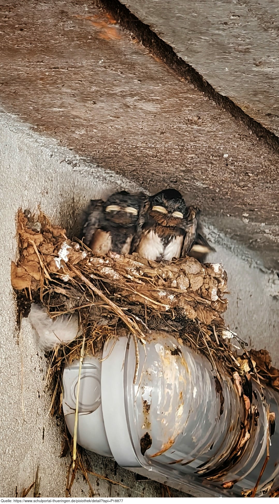 Das Foto gehört zur Serie "Schwalbenfreundliches Haus". Es zeigt junge Rauchschwalben im Nest. Das Nest befindet sich in einer Scheune, die für Vögel und Fledermäuse einige offene Durchflugsmöglichkeiten bereithält. Es gelten die Nutzungsbedingungen der Mediothek und Pixiothek.
