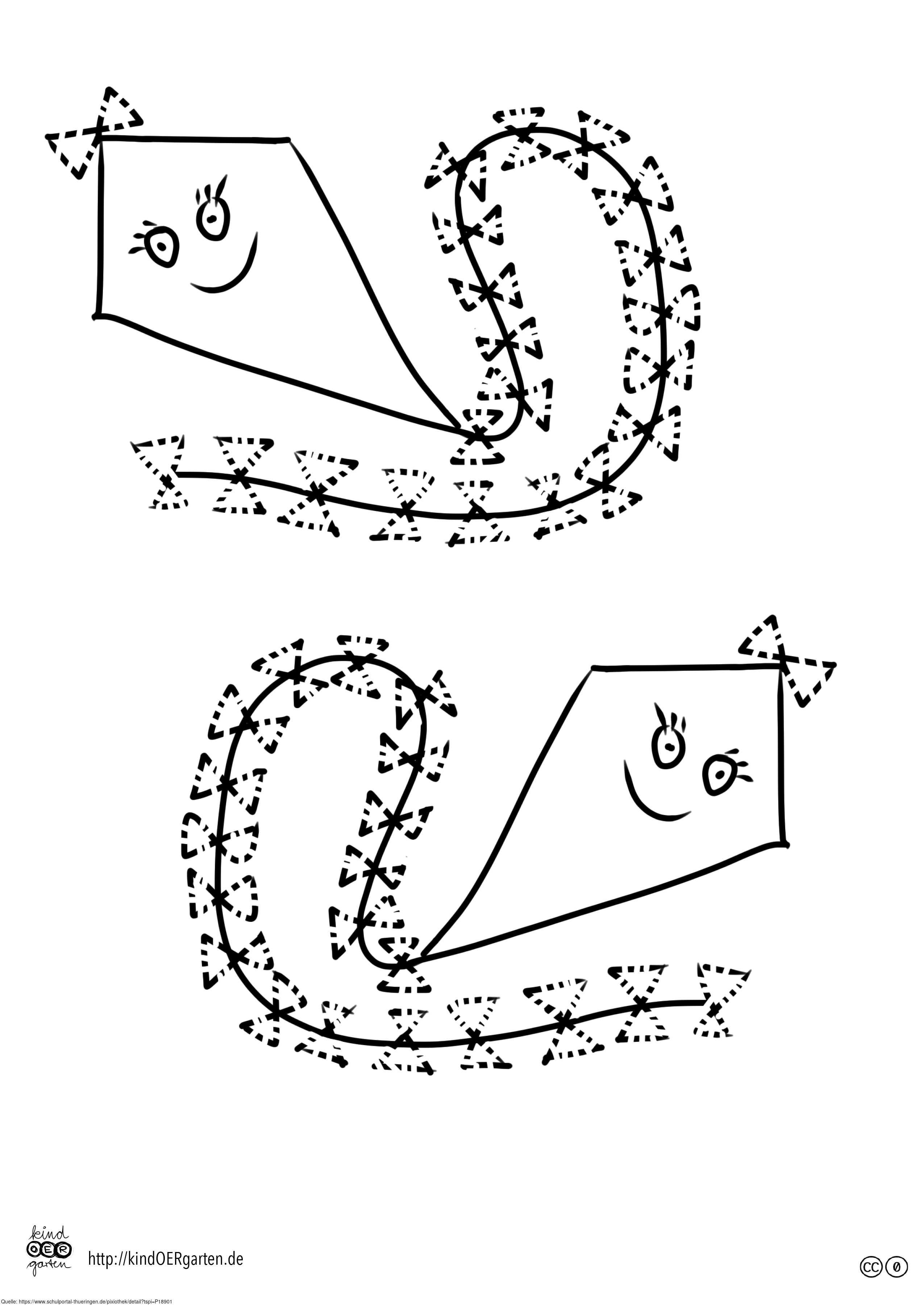 Das Bild zeigt zwei Drachen aus Papier (s/w) und kann als Schwungübung für Kinder im Kindergarten bzw. Elementarbereich dienen. Das Bild ist unter CC0 lizenziert und kann somit frei verwendet werden. Es ist neben weiteren Bildern auch hier zu finden: https://kindoergarten.wordpress.com/