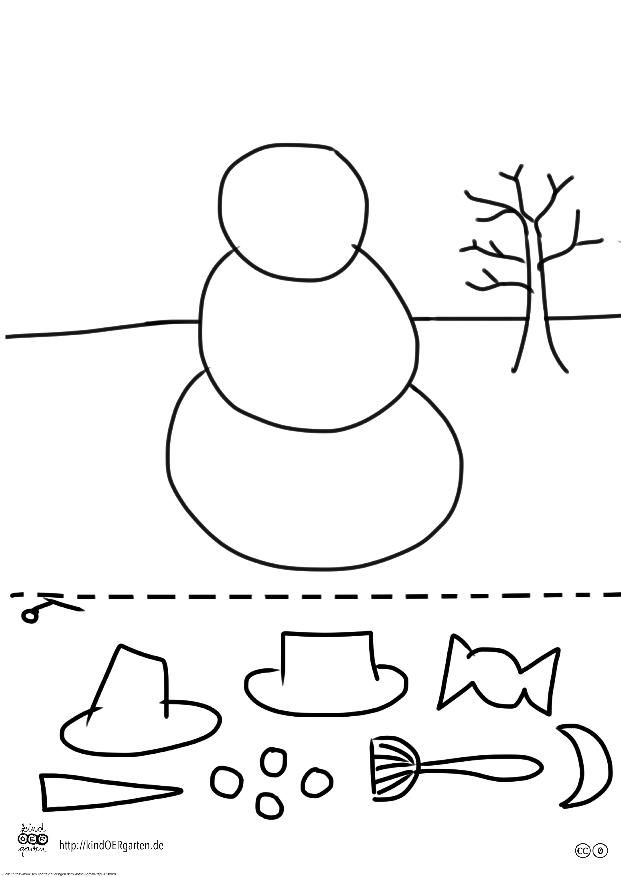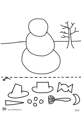 Das Bild zeigt einen Schneemann (s/w) und kann als Schnipselbildvorlage für Kinder im Kindergarten bzw. Elementarbereich dienen. Das Bild ist unter CC0 lizenziert und kann somit frei verwendet werden. Es ist neben weiteren Bildern auch hier zu finden: https://kindoergarten.wordpress.com/