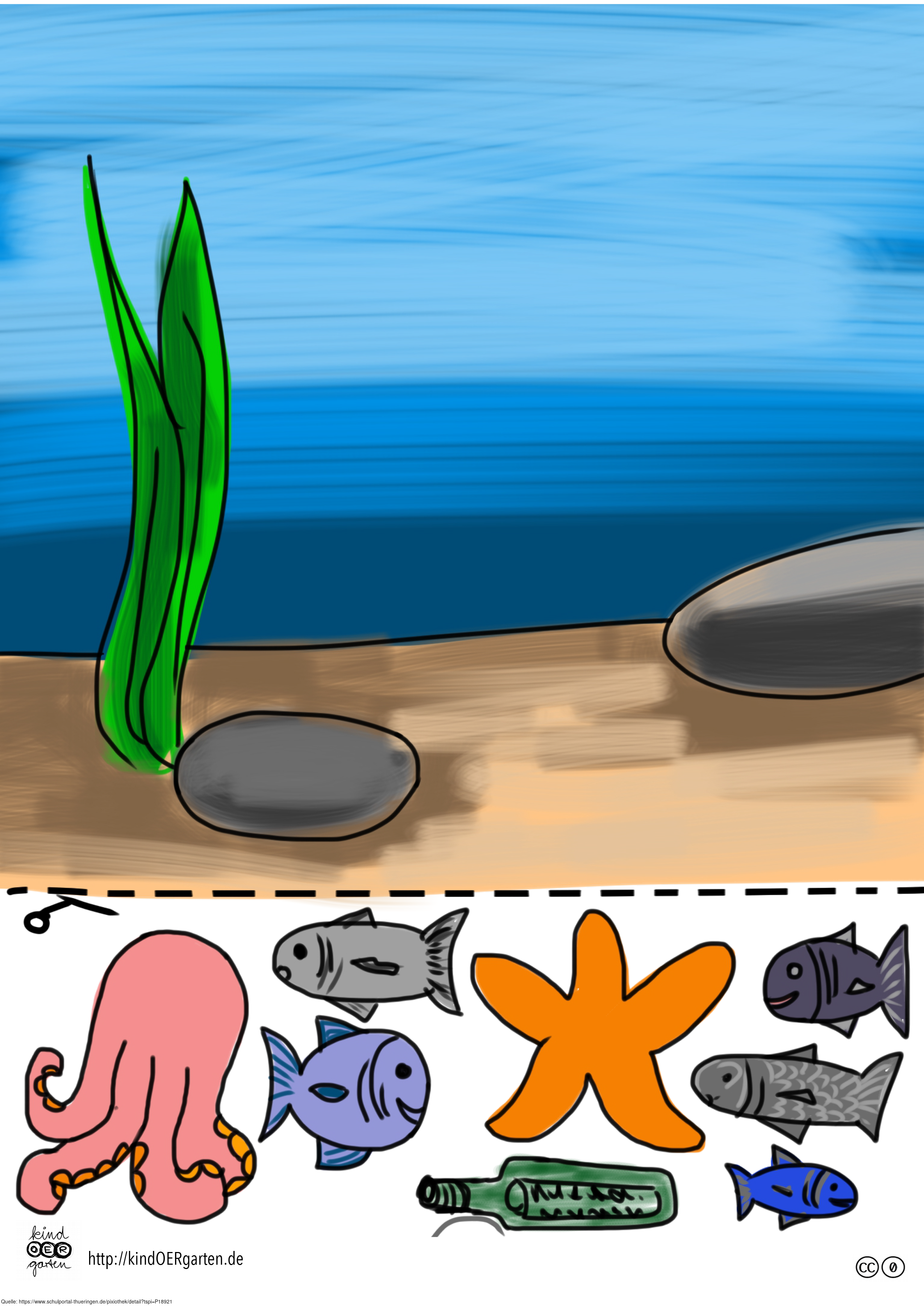 Das Bild zeigt das Motiv einer Unterwasserwelt (farbig) und kann als Schnipselbildvorlage für Kinder im Kindergarten bzw. Elementarbereich dienen. Das Bild ist unter CC0 lizenziert und kann somit frei verwendet werden. Es ist neben weiteren Bildern auch hier zu finden: https://kindoergarten.wordpress.com/