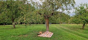 Das Bild zeigt eine Ansicht auf dem ApfelGut Erfurt mit Apfelbäumen sowie einem Picknickkorb und einer Decke auf der Streuobstwiese. Es gelten die Nutzungsbedingungen der Mediothek und Pixiothek.