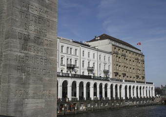 Hansestadt Hamburg: Gedenkstein Opfer 1. Weltkrieg mit Blick auf die Alsterarkaden